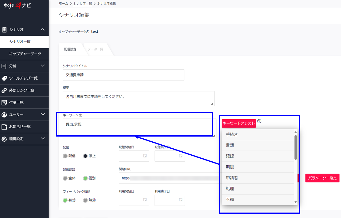 Webブラウザ上で画面操作のナビゲーションを表示する「シナリオ」や、ナビゲーションを表示しているWebページ以外へのリンクを登録する「外部リンク」の編集画面において、新設の「キーワードアシスト」ボタンを押すと、生成AIがタイトルや概要に入力した内容を基に「キーワード」の候補を列挙し、クリックするだけで「キーワード」を追加できる機能が実装されました。