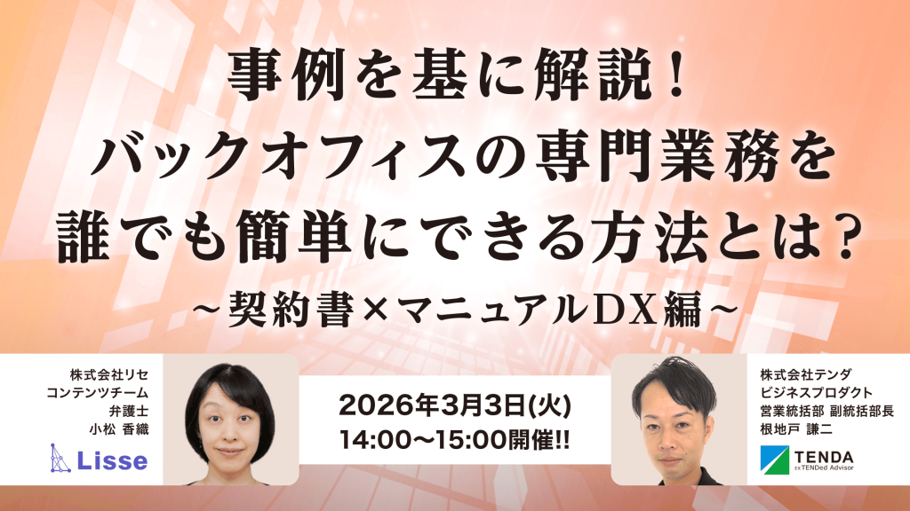 マニュアルトータルソリューションを提供し、企業の業務効率化を支援する株式会社テンダ(本社/東京都渋谷区、代表取締役会長兼社長CEO/薗部 晃、以下「テンダ」)は、株式会社リセ(本社:東京都千代田区、代表取締役CEO:藤田 美樹)と共催で、バックオフィス業務の属人化解消をテーマとしたオンラインセミナー「事例を基に解説!バックオフィスの専門業務を誰でも簡単にできる方法とは?-契約書✖マニュアルDX編-」を2026年3月3日(火)に開催いたします。